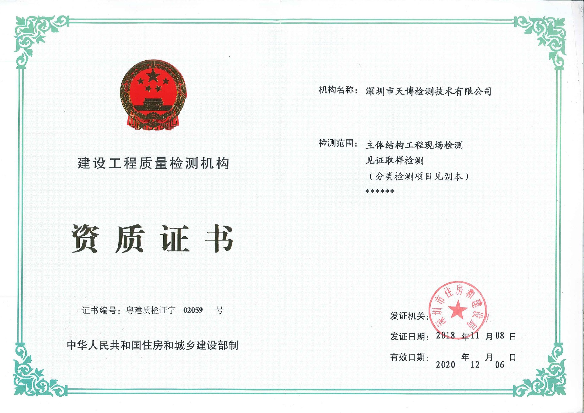 建设工程质量检测机构资质证书