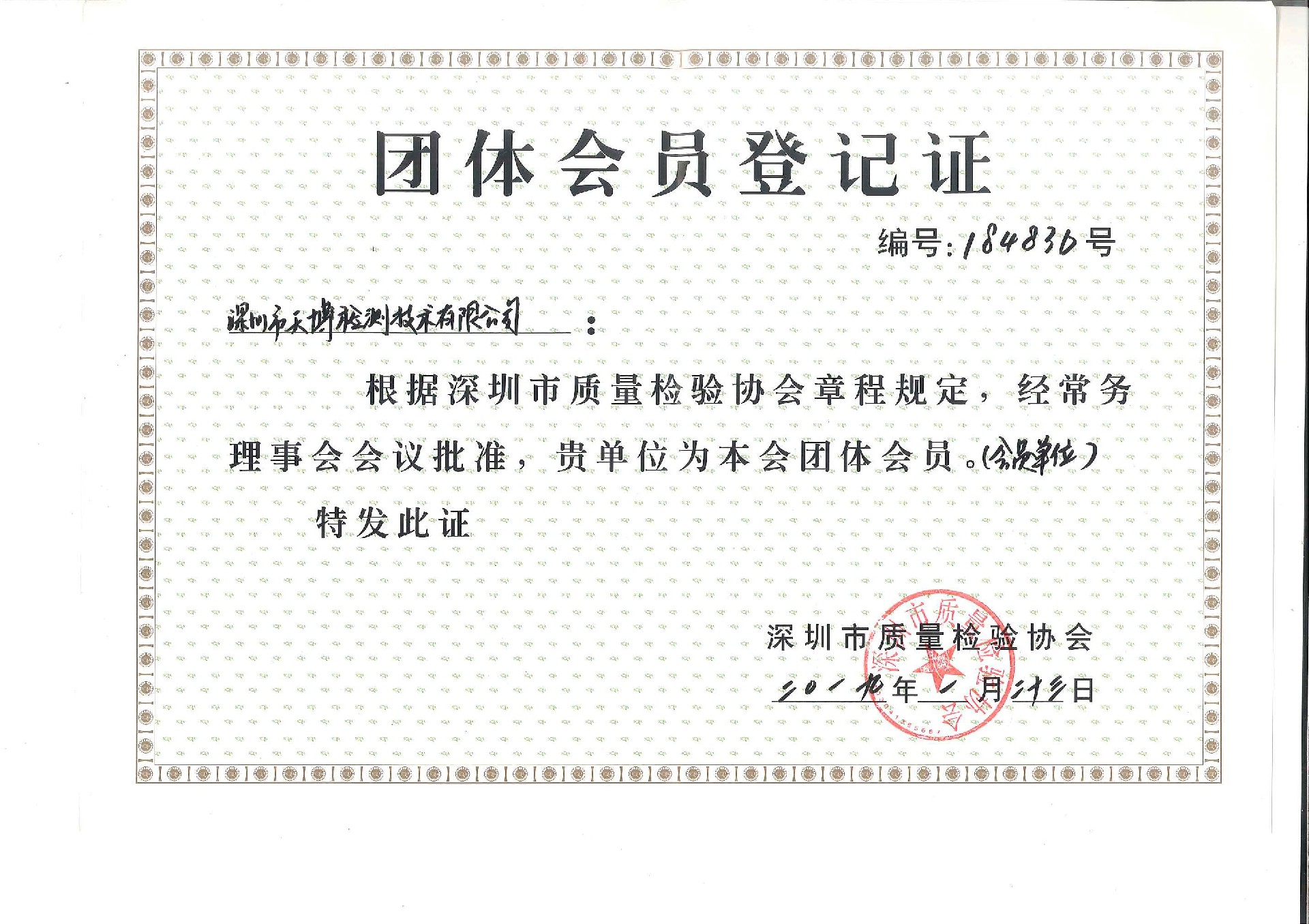 深圳质量检验协会会员登记证